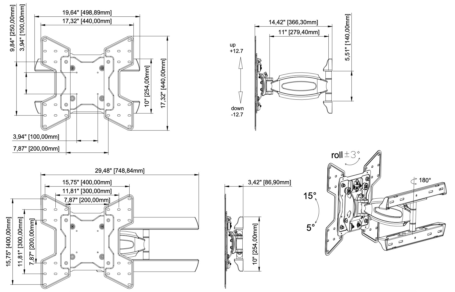 Wize Pro P55 - наклонно-поворотное крепление для телевизоров, профессиональных панелей и мониторов диагональю 32-55" и весом до 68 кг. Обеспечивает регулировку наклона +15/-5°, поворот 180°, вращение +6/-6°. Совместимо с VESA 100x100, 200x100, 200x200, 300x200, 300x300, 400x200, 400x300, 400x400 мм. Позволяет установить ЖК-панели и телевизоры на расстоянии 8-37 см от стены. Кабельный канал расположен внутри штанги.