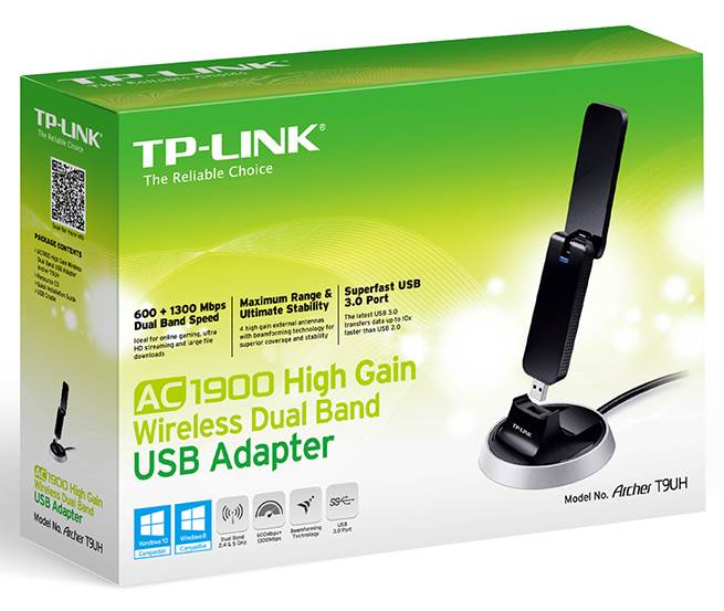 TP-Link Archer T9UH - мощный двухдиапазонный WiFi адаптер с интерфейсом USB 3.0 и поддержкой стандартов 802.11a/b/g/n/ac. Обеспечивает скорость соединения до 1300 Мбит/с в 5 ГГц диапазоне и до 600 Мбит/с в 2.4 ГГц. Оснащен 4-мя мощными всенаправленными антеннами, поддерживает технологию Beamforming. Совместим с ОС Windows, Mac OS и Linux. Поставляется в комплекте с USB-креддлом.