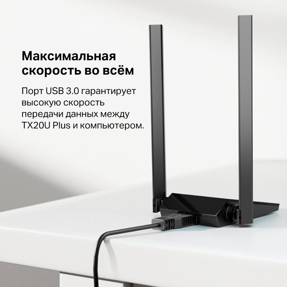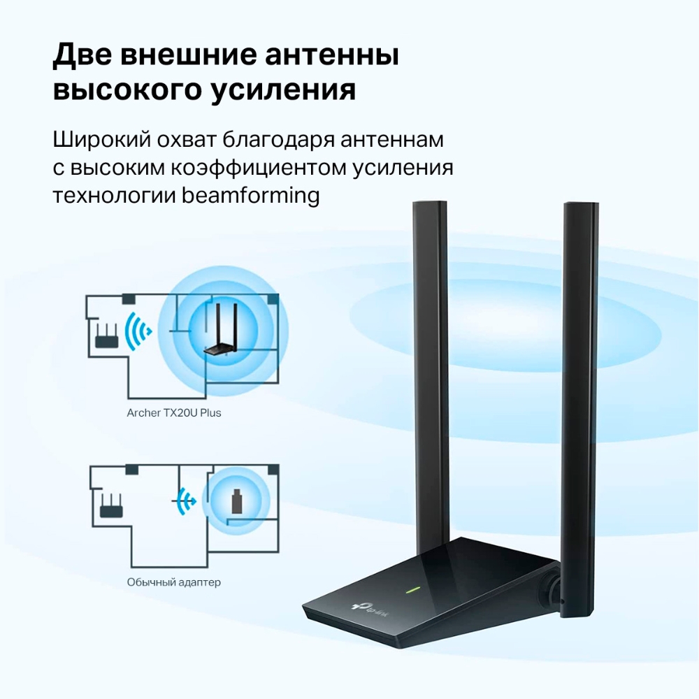 TP-Link Archer TX20U Plus - двухдиапазонный Wi-Fi адаптер высокого усиления с интерфейсом USB 3.0 и поддержкой стандартов 802.11a/b/g/n/ac/ax. Обеспечивает скорость соединения до 574 Мбит/с в 2.4 ГГц и до 1201 Мбит/с в 5 ГГц диапазонах. Оснащен 2-мя антеннами. Поддерживает технологии Beamforming, OFDMA, MU-MIMO.