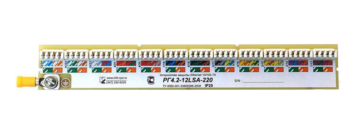 Info-Sys РГ4-12LSA - модуль грозозащиты с заземлением, оснащенный 12-ю 100-мегабитными портами. Обеспечивает надежную защиту сетевого оборудования от атмосферных разрядов и индустриальных помех. Модуль может быть смонтирован в 19" стойку с помощью специального 1U корпуса Info-Sys КМ19.
