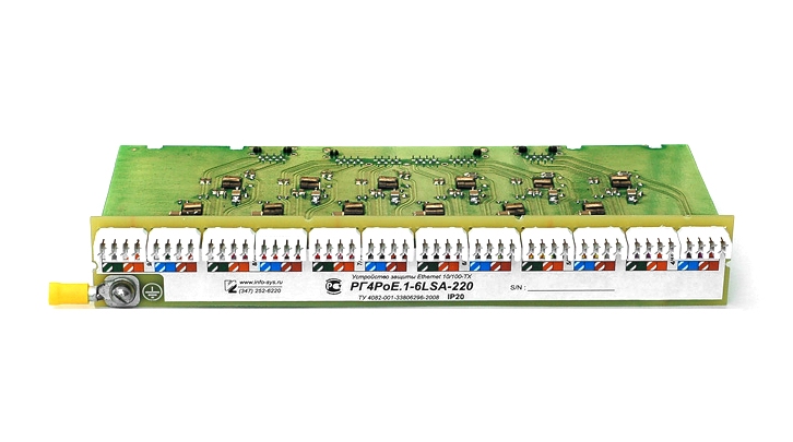 Info-Sys РГ4PoE-6LSA - модуль грозозащиты с заземлением, оснащенный 6-ю 100-мегабитными портами с поддержкой PoE (802.3af/at). Способно отвести на шину заземления токи до 5000 Ампер с сохранением работоспособности. Обеспечивает надежную защиту сетевого оборудования от атмосферных разрядов и индустриальных помех. Модуль может быть смонтирован в 19" стойку с помощью специального 1U корпуса Info-Sys КМ19.
