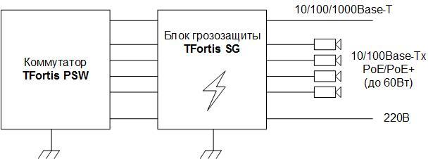 TFortis SG-Switch - блок грозозащиты, предназначенный для обеспечения дополнительной защиты цепей питания 220В и Ethernet коммутаторов TFortis PSW от помех большой энергии, наведенных мощными грозовыми разрядами. TFortis SG-Switch позволяет увеличить уровень грозозащиты коммутаторов TFortis PSW до класса 5 (по ГОСТ Р 51317.4.5).