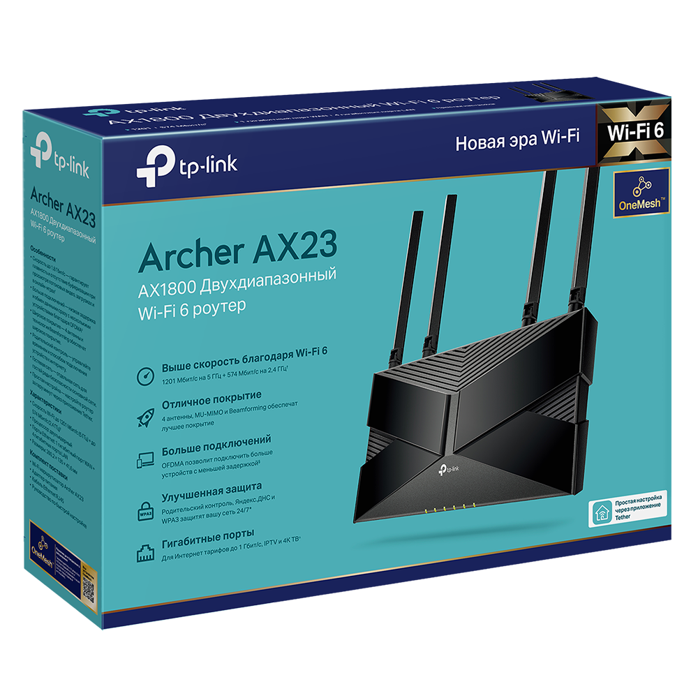 TP-Link Archer AX23 - 5-портовый гигабитный роутер (1 x WAN, 4 x LAN), оснащенный 2-диапазонным радиомодулем с поддержкой Wi-Fi 6 (Wi-Fi 4/5/6), 4 внешними антеннами с поддержкой MU-MIMO. Обеспечивает скорость соединения до 1201 Mbps в 5 ГГц и 574 Mbps в 2.4 ГГц. Поддерживает OFDMA, Airtime Fairness, технологии OneMesh и EasyMesh, функции родительского контроля.