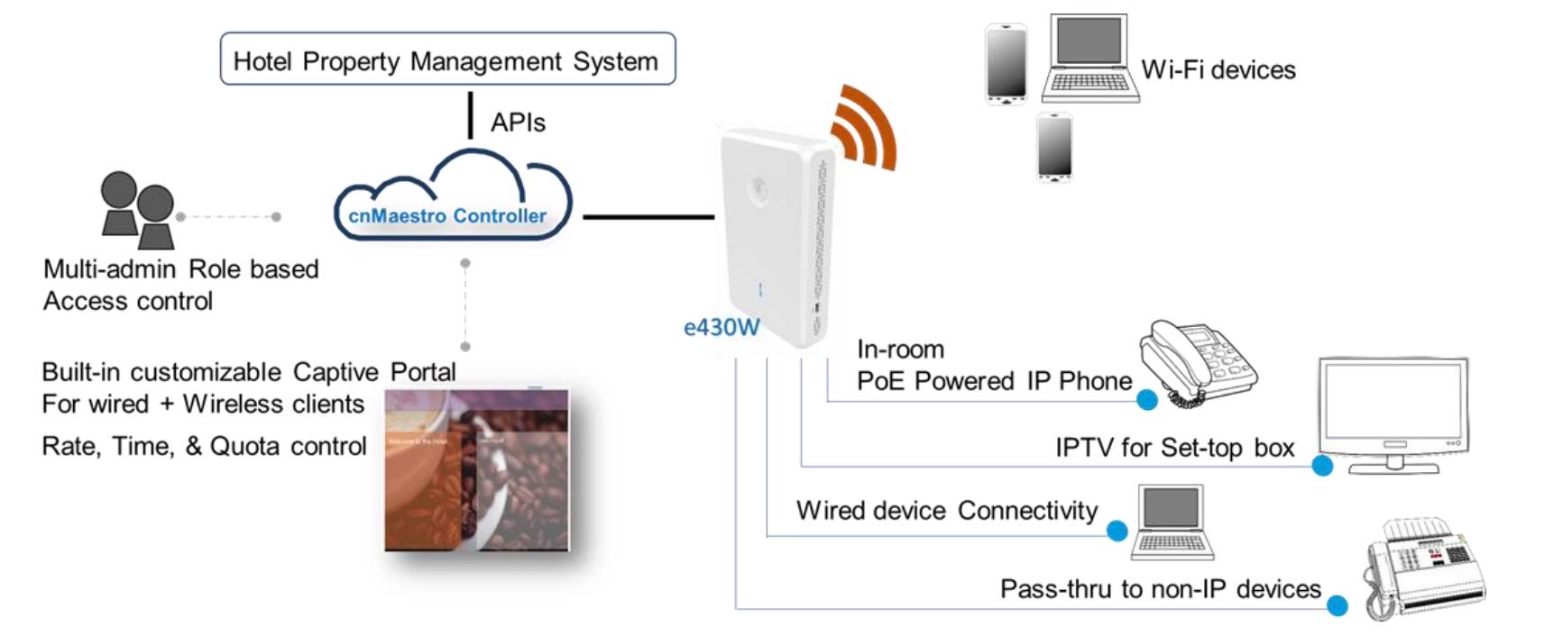 Cambium cnPilot e430W - точка доступа WiFi класса Enterprise в настенном форм-факторе, предназначенная для эксплуатации в сфере гостеприимства, здравоохранения, частных домохозяйств. Работает в диапазонах 2.4 и 5 ГГц, поддерживает стандарты 802.11n/ac Wave 2, MU-MIMO 2x2. Оснащена 6-ю гигабитными портами RJ45 (1 порт с поддержкой PoE-In 802.3af, 2 порта с поддержкой PoE-Out 802.3af). Способна обслуживать до 256 клиентов на расстоянии до 50 метров. Точка доступа Cambium cnPilot e430W поддерживает работу под управлением контроллера и автономно, поддерживает технологию Mesh.