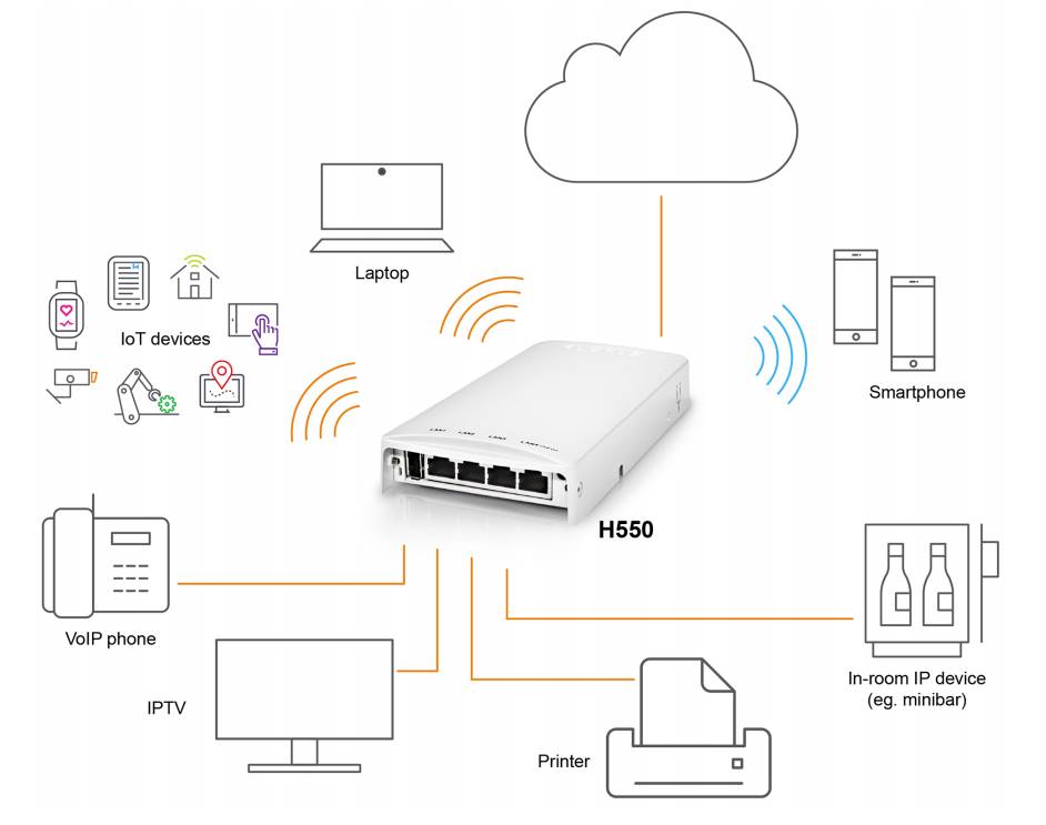 Ruckus H550 идеально подходит для инсталляций в гостиницах / отелях / учебных заведениях / квартирах и частных домах; стандартный дизайн сети на базе H550 - это размещение точек доступа в каждом номере / комнате, что позволяет обеспечить высокий уровень производительности сети (комбинированная скорость передачи данных - до 1774 Мбит/с), так и идеальное покрытие Wi-Fi.