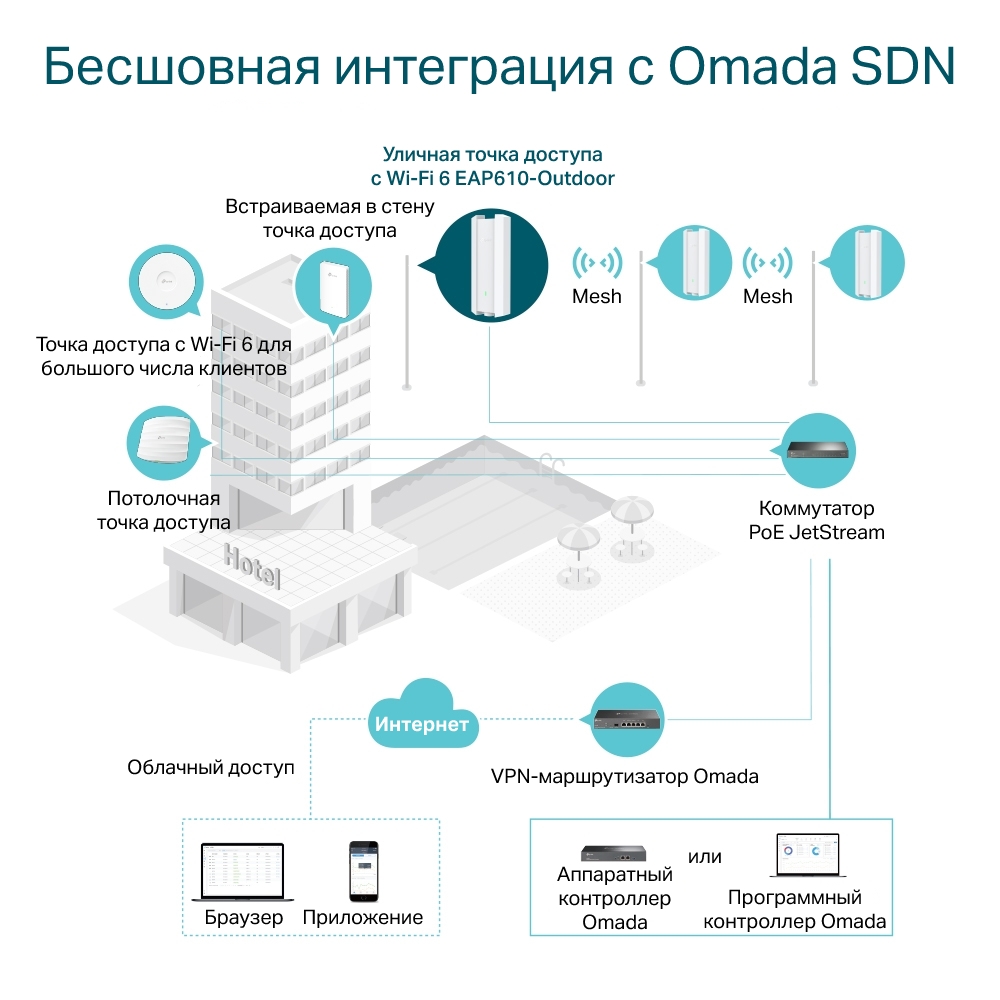 Точки доступа TP-Link серии Omada могут объединяться в бесшовные сети, и управляются централизованно с помощью программного / аппаратного / облачного контроллера, в возможности которого входит в том числе предоставление портала аутентификации гостевых пользователей.