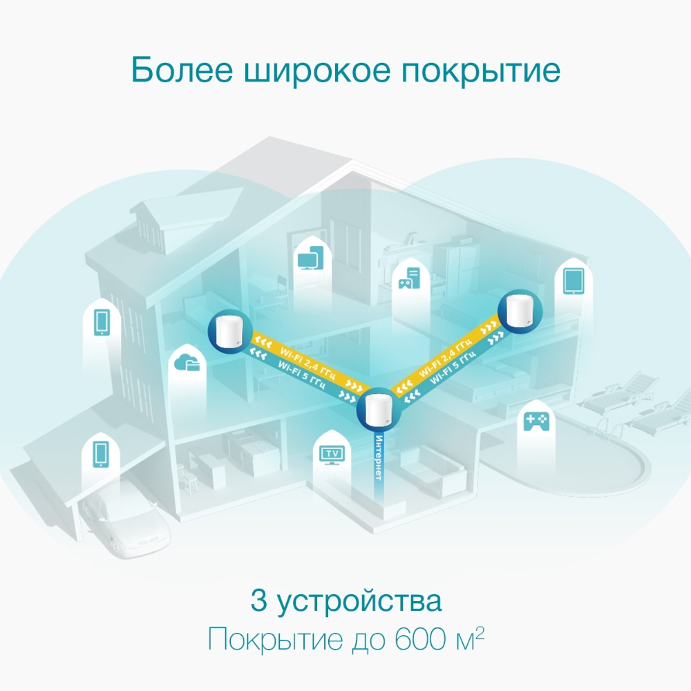TP-Link Deco X50 3-Pack - домашняя Wi-Fi система, состоящая из 3 устройств (роутеров), совместно обеспечивающих покрытие Wi-Fi до 600 квадратных метров. Связь между устройствами устанавливается при помощи технологии Mesh.