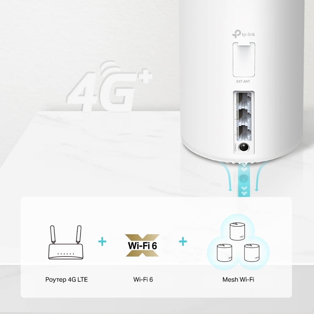TP-Link Deco X50-4G - 4G-маршрутизатор, являющийся частью WiFi-системы Deco или самостоятельным устройством. Связь между устройствами cемейства устанавливается при помощи технологии Mesh, т.е. не требует проводного подключения к сети.