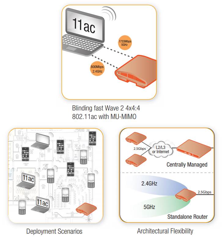 Точки доступа ZoneFlex R720 могут быть развернуты в качестве автономных точек доступа или в составе беспроводной сети, централизованно управляемой интеллектуальными контроллерами WLAN ZoneDirector. Точка доступа ZoneFlex серии R720 может быть развернута в любых сетях L2/L3 и может выступать в качестве моста для пропускания трафика в локальную сеть, создавать туннель к центральному узлу с использованием протокола L2TP или PPPoE или выполнять маршрутизацию между WAN и скрытыми за NAT частными подсетями. При использовании ZoneDirector каждая точка доступа ZoneFlex R720 автоматически настраивается по сети, что делает процесс развертывания быстрым и простым.