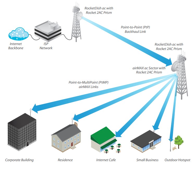 Ubiquiti Rocket 2AC Prism - уличная точка доступа, работающая в диапазоне 2.4 ГГц. Предназначена для работы в режиме радиомоста, базовой станции или беспроводного клиента. Поддерживает 2x2 MIMO, TDMA-протокол AirMax, технологию airPrism, GPS-синхронизацию, модуляцию до 256QAM, ширину канала 10/20/40 МГц; позволяет создавать беспроводные линии связи на расстоянии 50+ км при скорости до 330 Мбит/с. Совместимы с секторными, направленными и всенаправленными антеннами AirMax и RocketDish.