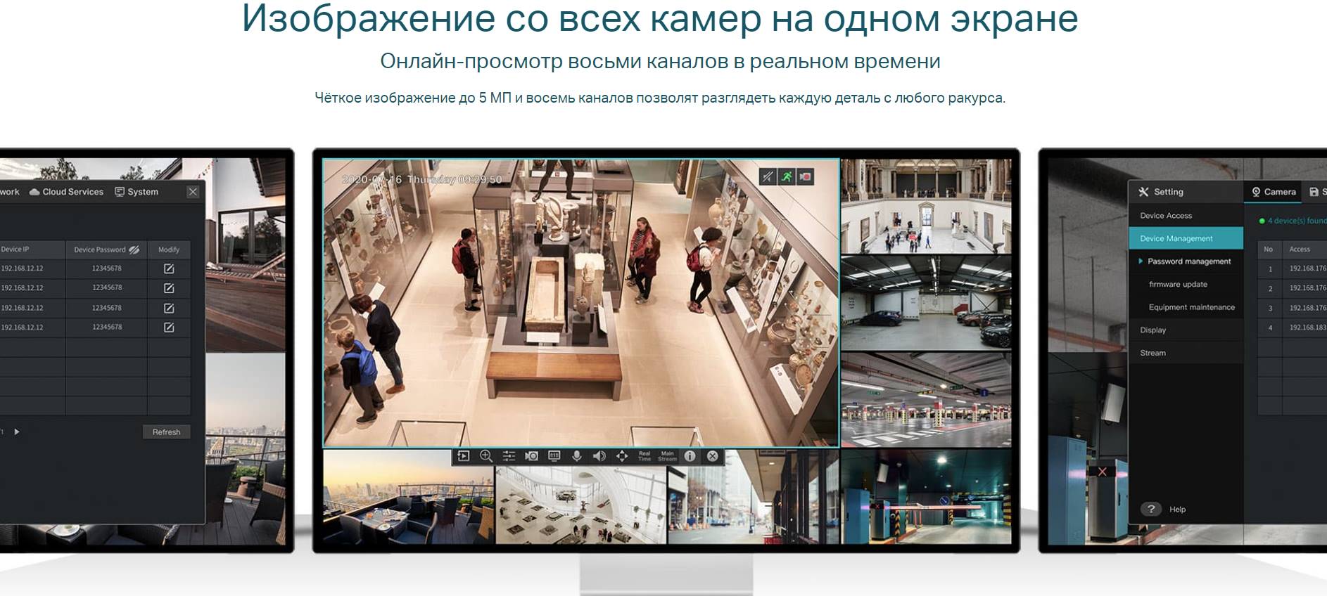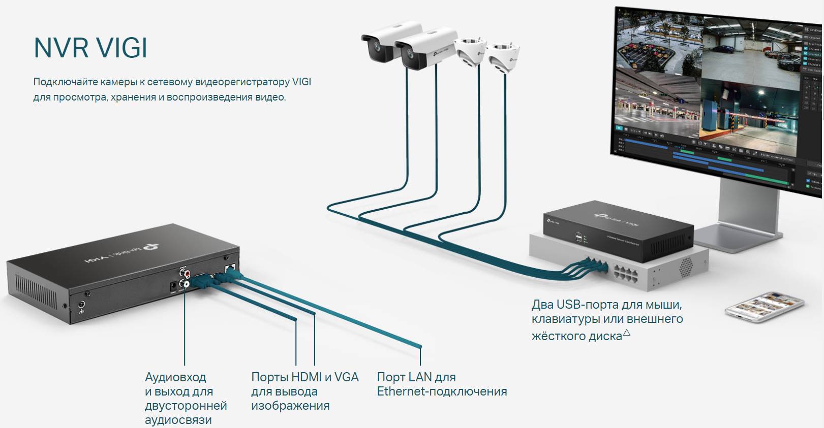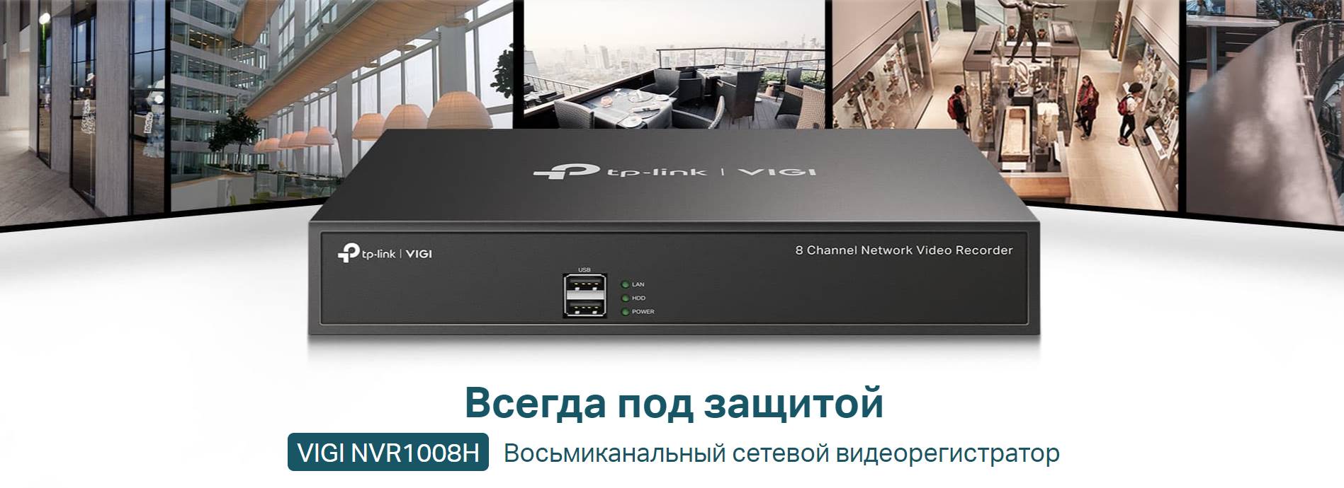 TP-Link VIGI NVR1008H - 8-канальный IP-видеорегистратор. Поддерживает установку жесткого диска SATA 3.5" емкостью до 10 ТБ. Обеспечивает просмотр в режиме онлайн до 8 каналов с разрешением до 5 Мп. Поддерживает запись H.265+, совместим со стандартом ONVIF. Оснащен портом RJ45 10/100 Mbps, 2-мя портами USB 2.0 (служат для подключения клавиатуры, мыши или внешнего HDD), выходами VGA и HDMI.