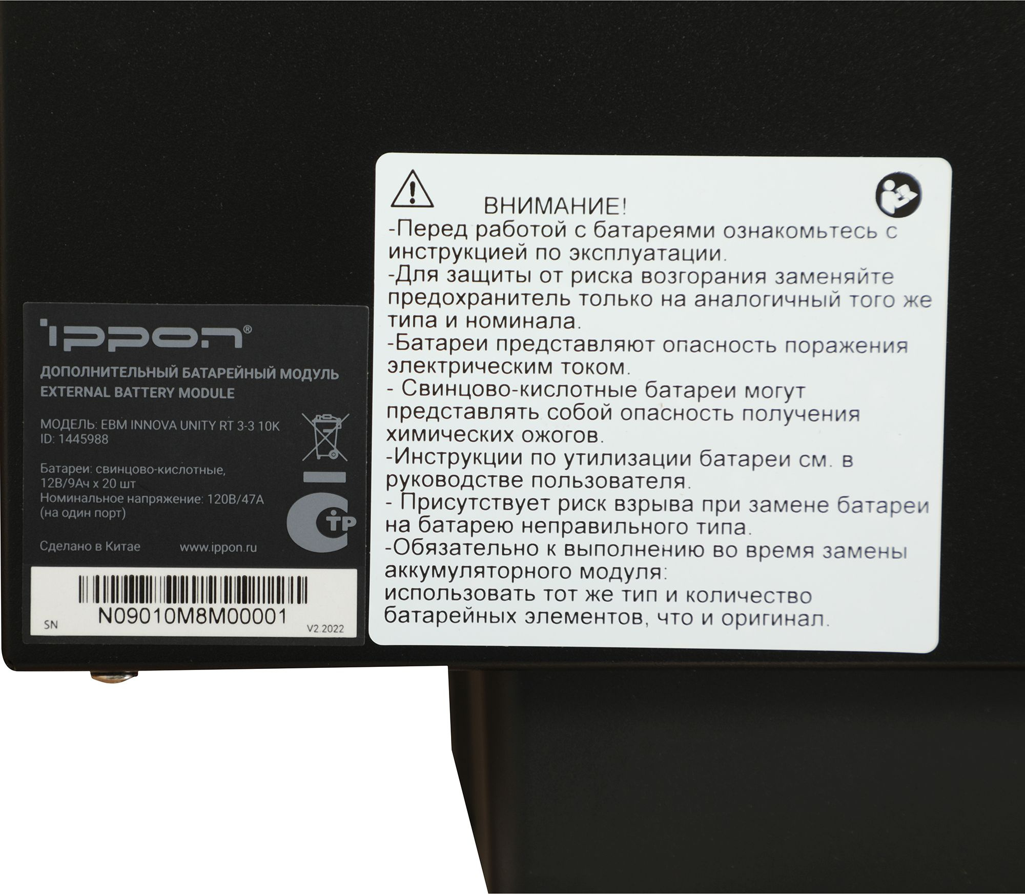 Ippon EBM Innova Unity RT 3-3 10K (1445988) - батарейный модуль, служащий для увеличения времени автономной работы электрооборудования, подключенного к ИБП Ippon Innova RT 3-3 10K. Возможно подключение до 4-х батарейных модулей одновременно. Оснащен 20-ю батареями 12 В / 7 Ач.