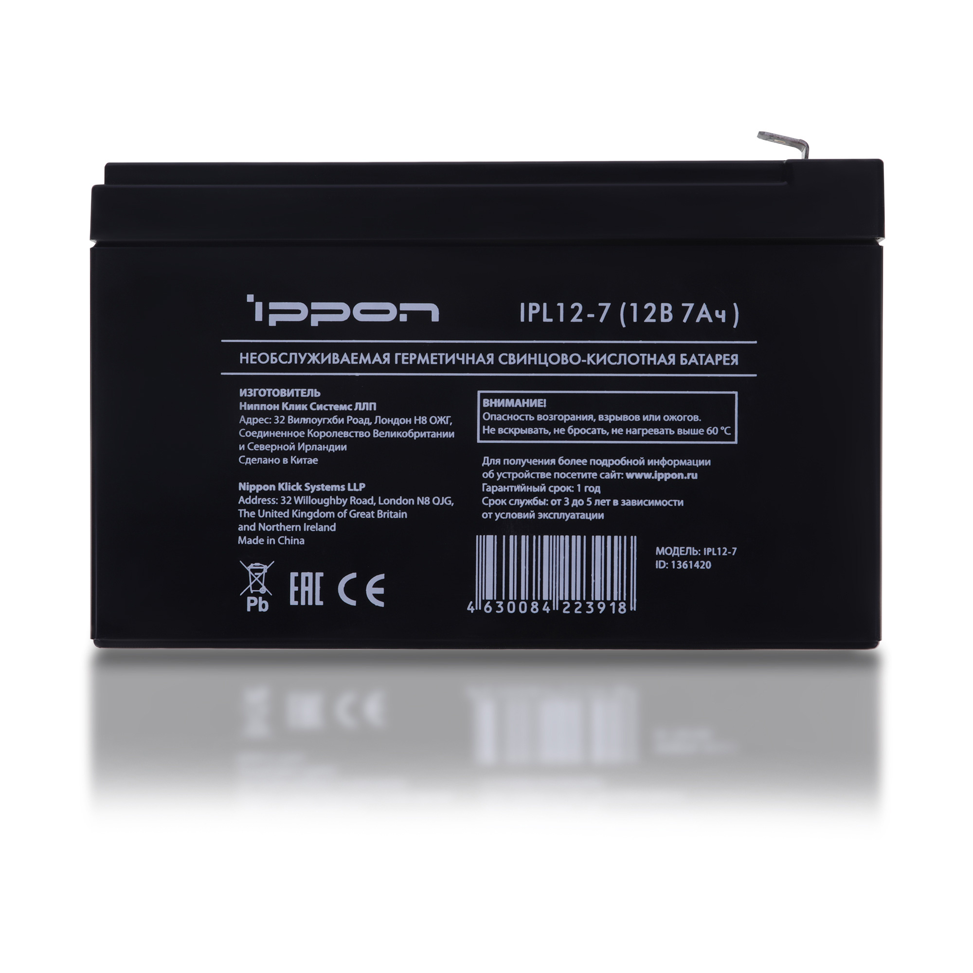 Ippon IPL12-7 - необслуживаемая, герметичная, свинцово-кислотная батарея, обеспечивающая напряжение 12 В и номинальную емкость 7 Ач. Оснащена клеммами T2, выполнена из ABS. Увеличенный срок службы (10-12 лет) по сравнению с аккумуляторной батареей Ippon IP12-7.