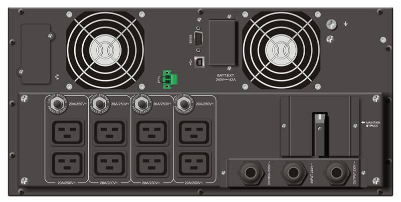 | Выход | Напряжение: 220/230/240 В Стабильность напряжения: +/- 1 % Регулировка напряжения (режим работы от батарей): ±5% Частота: 50 Гц или 60 Гц (автоопределение) Форма сигнала: Синусоидальный сигнал Время переключения: 0 мс Разъемы с питанием от батареи: 8 x IEC C19, клеммный блок Автоматический байпас: есть Механический байпас: есть Резервирование мощности: до 2 устройств в параллельной системе |