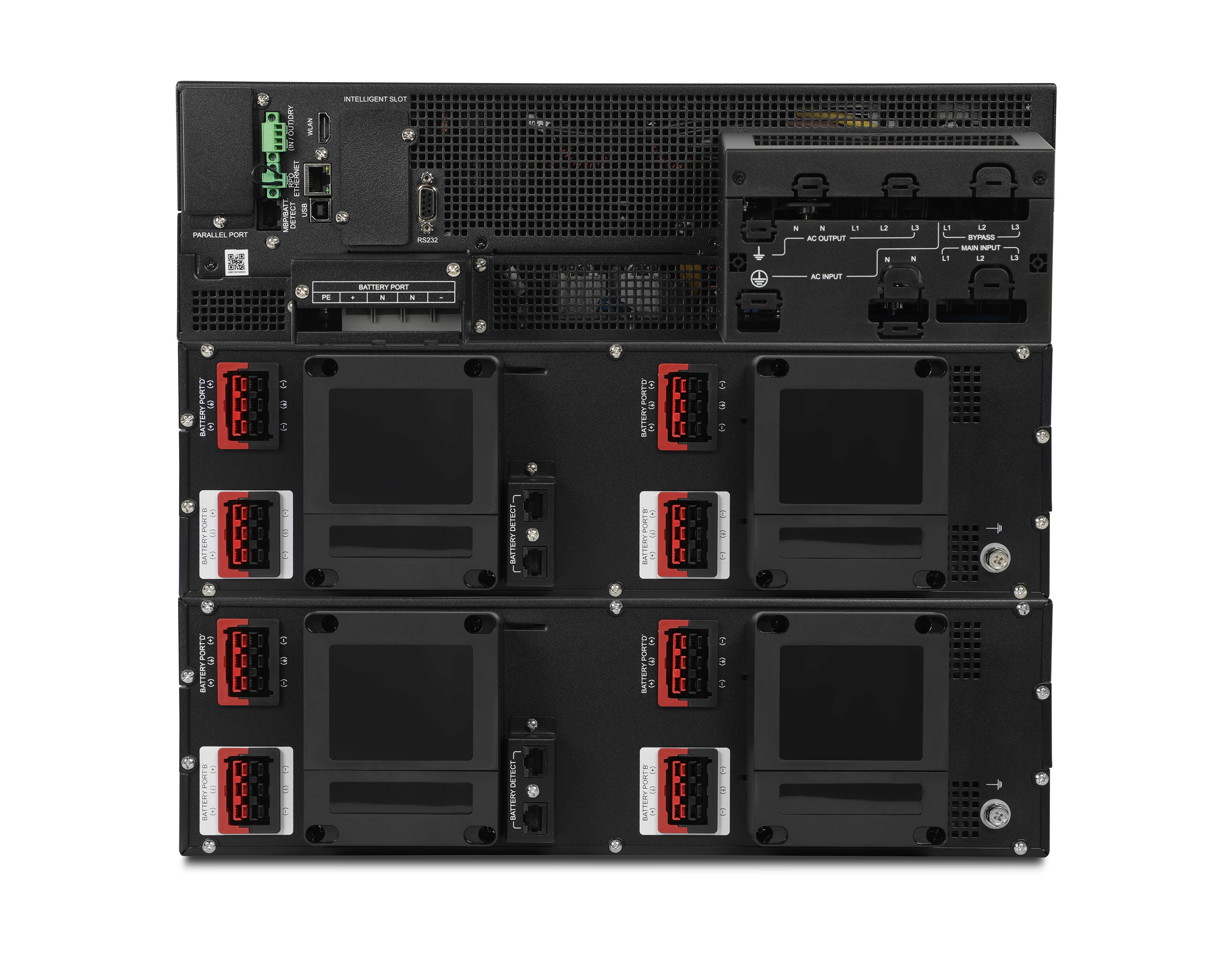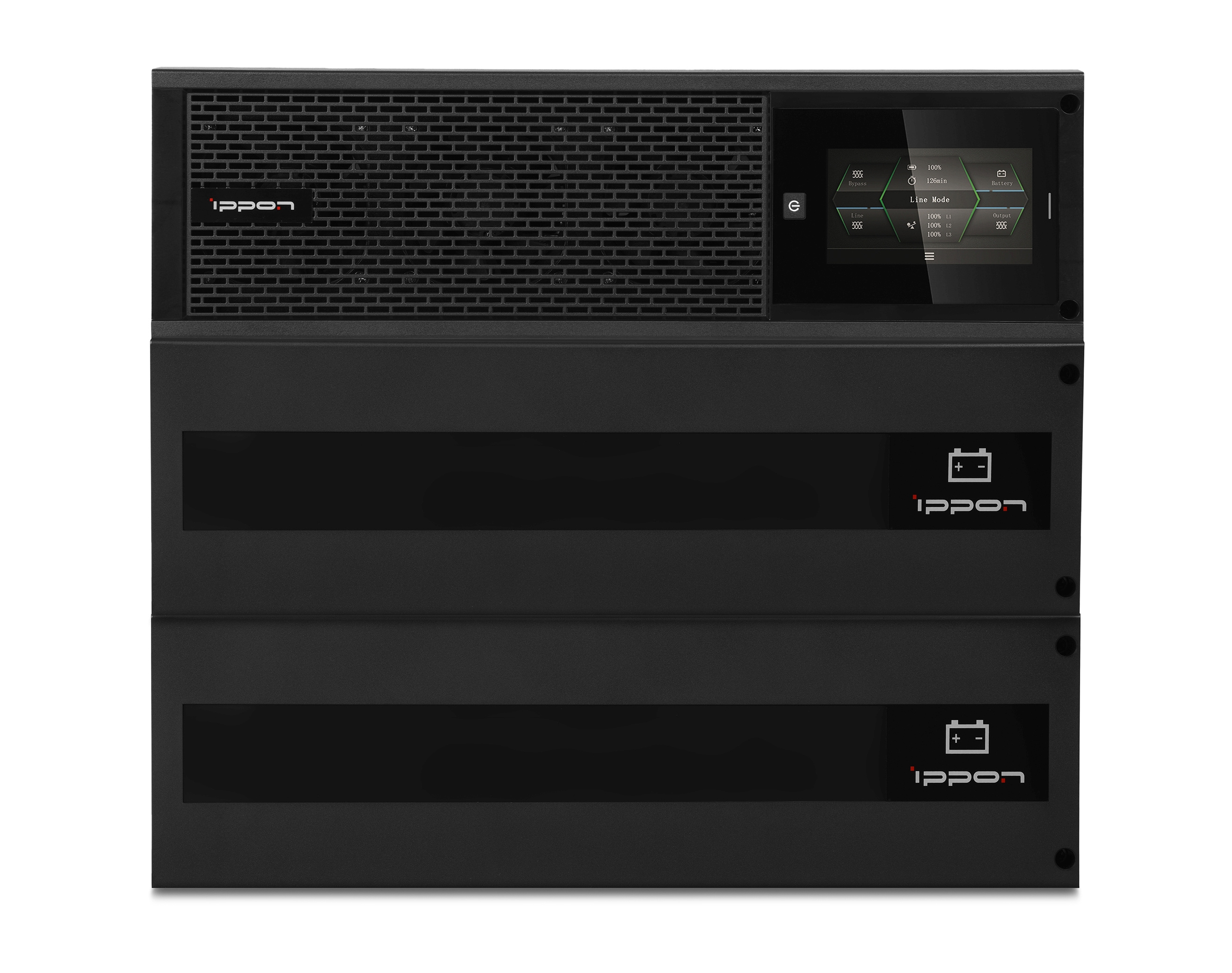 | Батареи | Тип батареи: 40 x 12 В / 9 Ач Время автономной работы при 30% нагрузке: 18.2 минуты Время автономной работы при 50% нагрузке: 10.1 минуты Время автономной работы при 70% нагрузке: 6.6 минуты Время автономной работы при 100% нагрузке: 3.4 минут Время зарядки: 3 часа до 90% после полной разрядки |