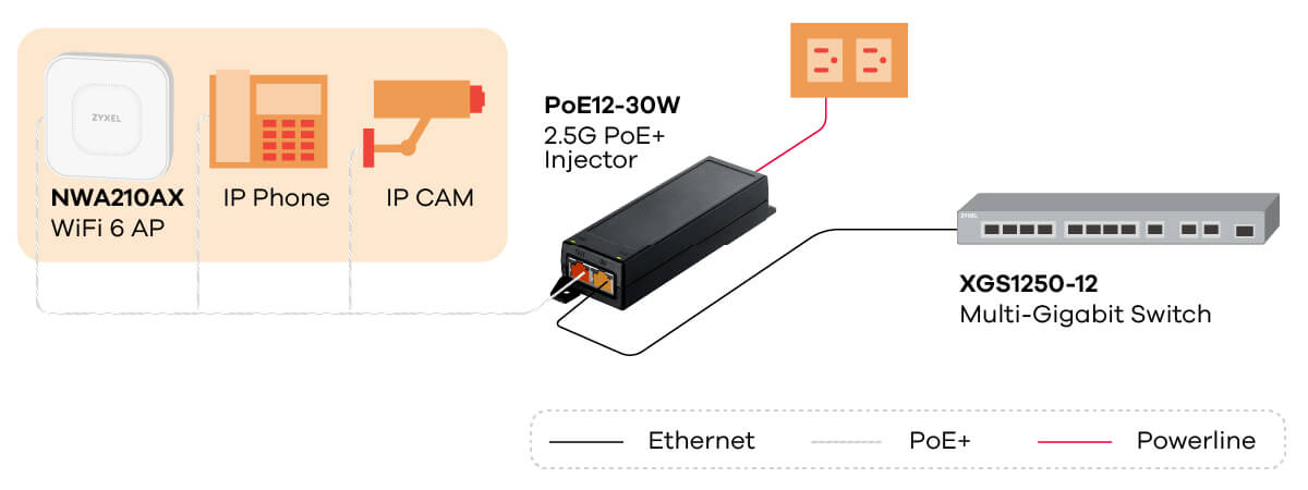 Zyxel PoE12-30W - однопортовый мультигигабитный PoE-инжектор. Поддерживает стандарт IEEE 802.3at, обеспечивает передачу данных на скорости 2.5 Gbps и питание до 30 Вт. Предусмотрен настенный и настольный монтаж.