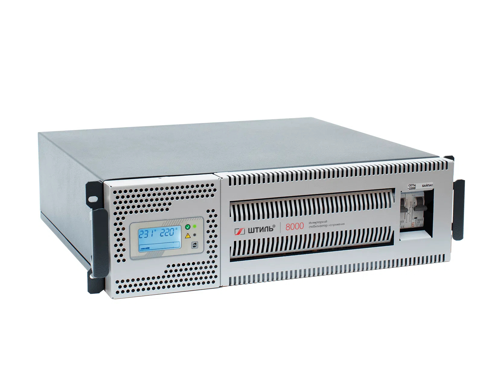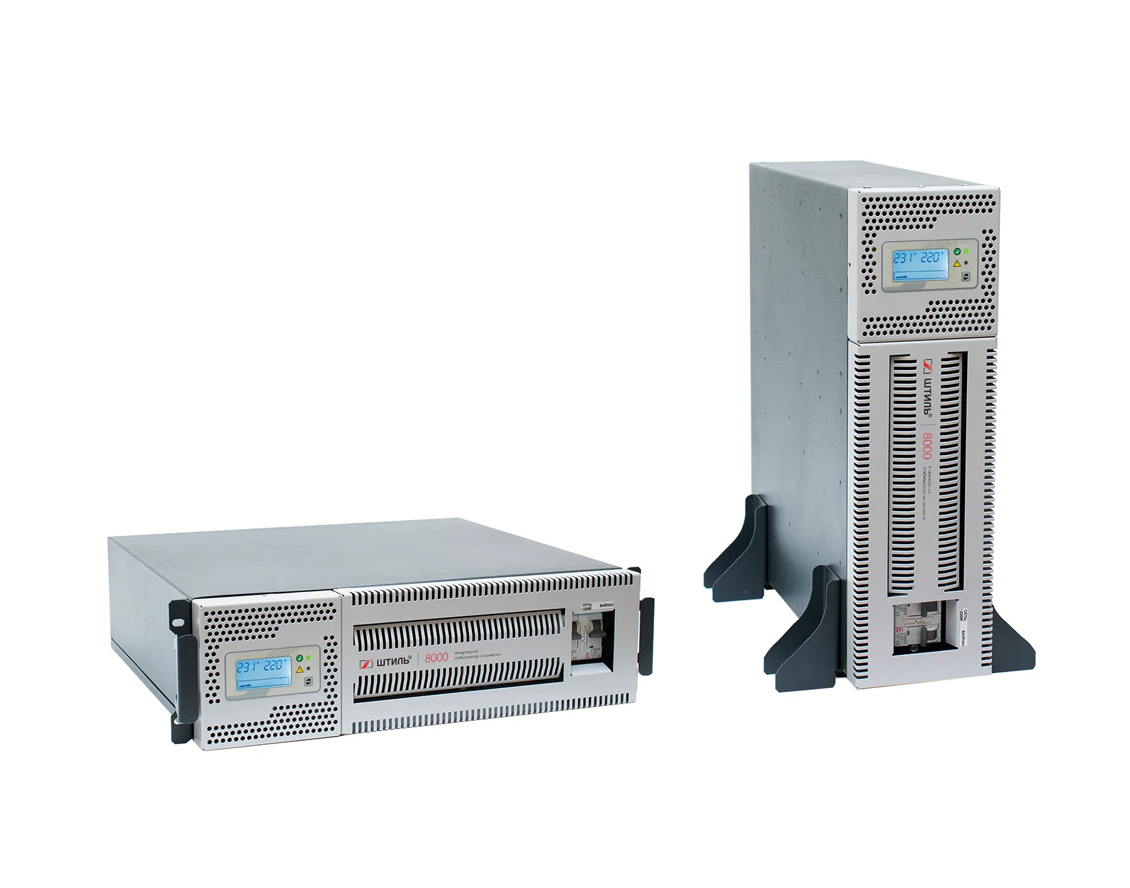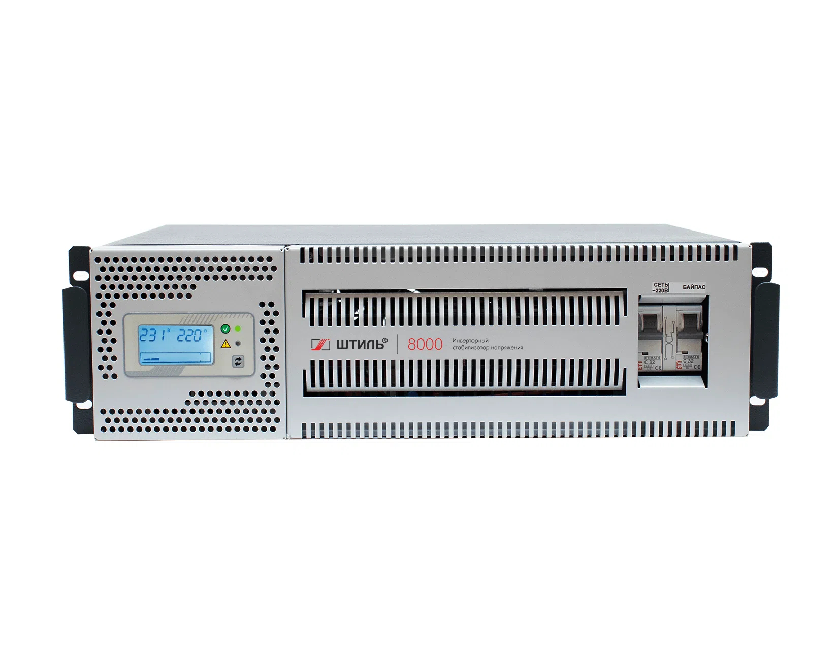 Штиль IS8000RT - стабилизатор напряжения мощностью 8000 VA, предназначенный для защиты телекоммуникационной техники, торгового и производственного оборудования, серверов и систем хранения данных, систем пожарной безопасности и видеонаблюдения, систем вентиляции и кондиционирования от нестабильной подачи электроэнергии и сбоев в сети. Оснащен поворотной панелью управления, 4-мя вентиляторами, слотом для карт расширения интерфейсов. Предусматривает монтаж в 19" шкаф/стойку (3U) и на стол в вертикальном положении с помощью упоров.