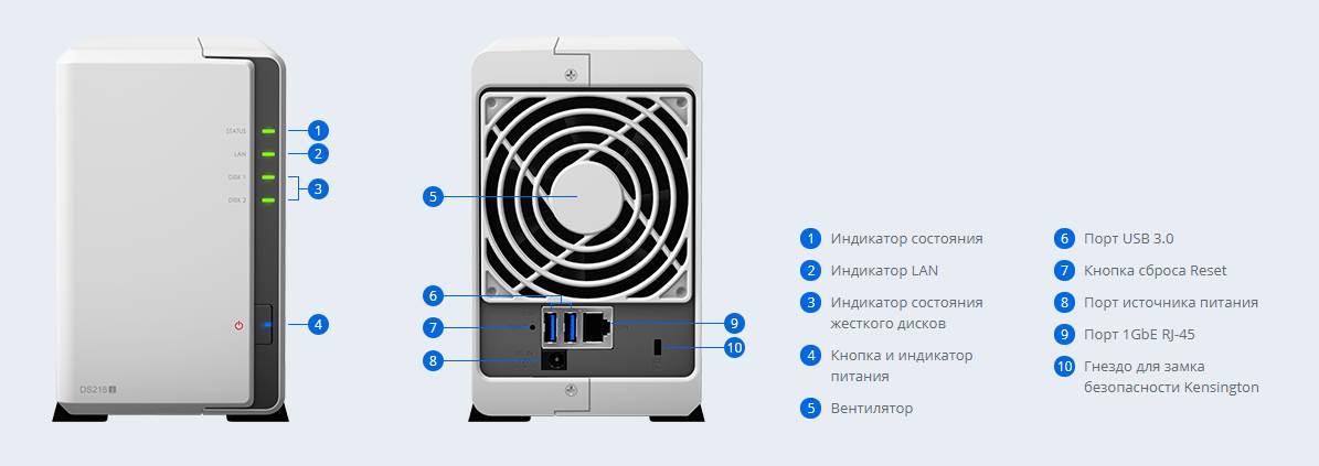 Synology DiskStation DS218j - сетевой накопитель (NAS) с двумя дисковыми отсеками SATA. Поддерживает HDD и SSD 2.5 и 3.5", RAID уровней Synology Hybrid RAID, Basic, JBOD, RAID 0, RAID 1, "горячую" замену дисков. Оснащен гигабитным сетевым интерфейсом RJ45 и 2-мя портами USB. Совместим с рядом сервисного ПО от Synology: