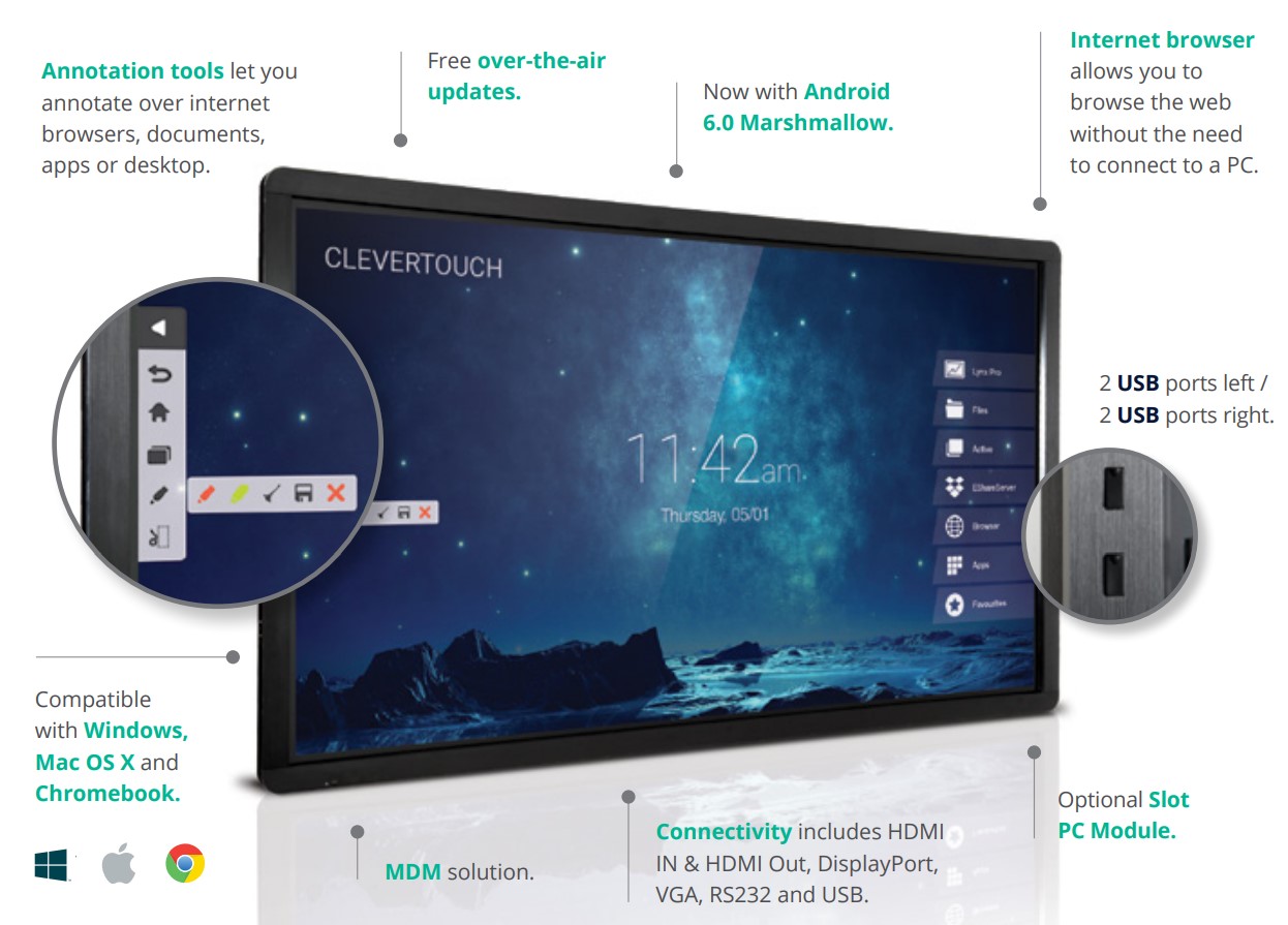Clevertouch 55" Pro IR Touch 15455PRO - интерактивная панель для переговорных / конференц-залов / учебных заведений. Оснащена высококачественным 55" дисплеем с разрешением 4K Ultra HD и с поддержкой распознавания до 20 одновременных касаний. Экран покрыт защитным стеклом толщиной 4 мм. В панель встроен производительный компьютер с 4-ядерным процессором с предустановленными ОС Android 6.0 Marshmallow, оболочкой LUX и рядом приложений: