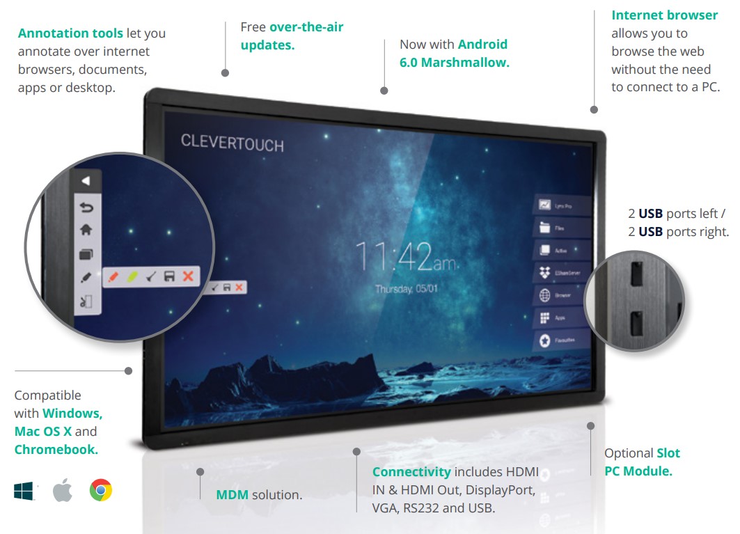 Clevertouch 70" Pro IR Touch 15470PRO - интерактивная панель для переговорных / конференц-залов / учебных заведений. Оснащена высококачественным 70" дисплеем с разрешением 4K Ultra HD и с поддержкой распознавания до 20 одновременных касаний. Экран покрыт защитным стеклом толщиной 4 мм. В панель встроен производительный компьютер с 4-ядерным процессором с предустановленными ОС Android 6.0 Marshmallow, оболочкой LUX и рядом приложений: