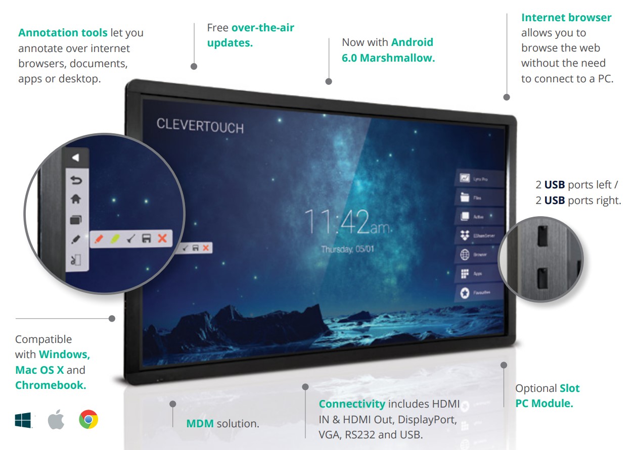 Clevertouch 86" Pro IR Touch 15486PRO - интерактивная панель для переговорных / конференц-залов / учебных заведений. Оснащена высококачественным 86" дисплеем с разрешением 4K Ultra HD и с поддержкой распознавания до 20 одновременных касаний. Экран покрыт защитным стеклом толщиной 4 мм. В панель встроен производительный компьютер с 4-ядерным процессором с предустановленными ОС Android 6.0 Marshmallow, оболочкой LUX и рядом приложений: