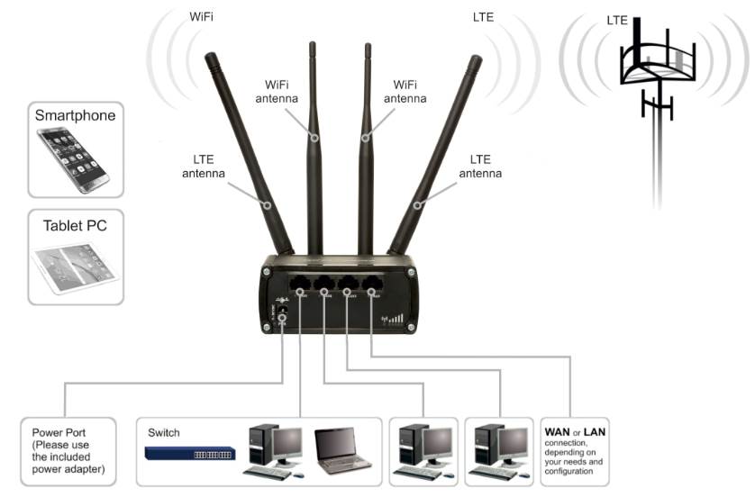 | Интерфейсы | 4 x RJ45 10/100 Мбит/с (1 x WAN, 3 x LAN) 2 x SMA LTE 2 x RP-SMA WiFi |