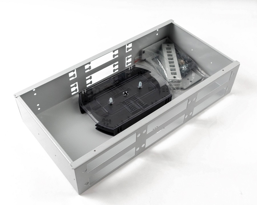 Hyperline FO-19R-2U-6xSLT-W140H42-48UN-GY - универсальный 19" оптический бокс. Рассчитан на емкость от 8 до 48 портов SC / Duplex LC / ST / FC. Оснащен сплайс-пластиной. Выполнен в 2U форм-факторе в сером цвете.