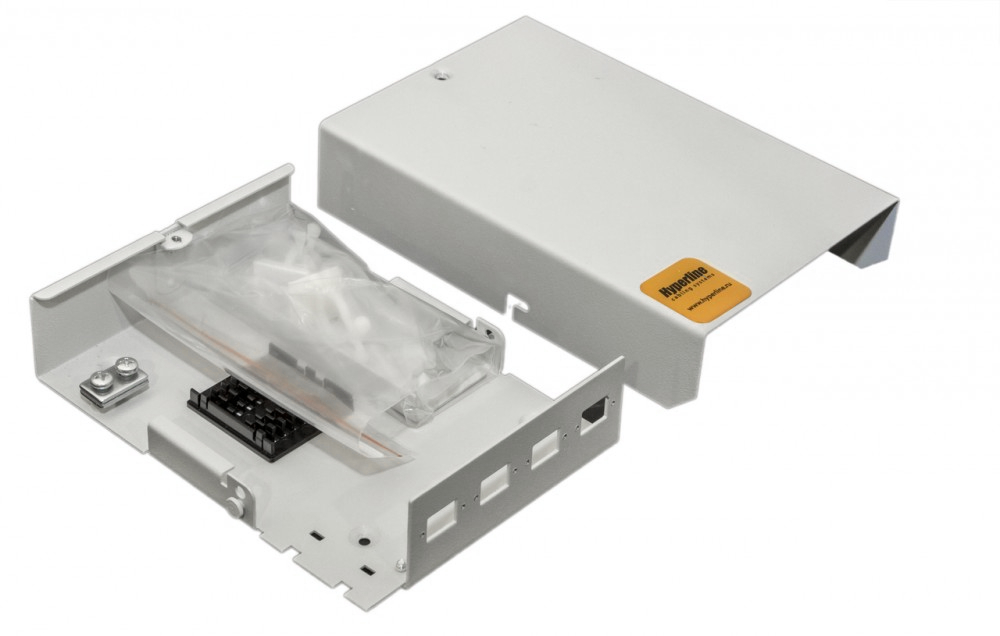 Hyperline FO-WBY-4UN-MK - универсальный настенный оптический бокс. Рассчитан на емкость до 4 портов SC / Duplex LC / ST / FC. Оснащен держателем для 8 КДЗС.