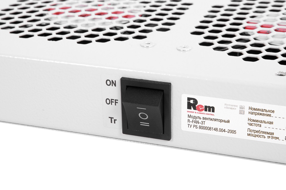 ЦМО R-FAN-3T - вентиляторный модуль для установки в настенные и напольные шкафы и стойки. Предназначен для отвода или нагнетания воздуха шкафы. Используется для установки в подготовленное отверстие (крыша/дно) в настенных и напольных телекоммуникационных шкафах (ШРН, ШРН-Э, ШРН-М, ШРН-С, ШТК-М, ШТК-С, ШТВ и EMS). Модуль оснащен тремя односкоростными, осевыми вентиляторами с изменением направления потока (направление потока указан на этикетке стрелкой) и терморегулятором. Порог включения задается в пределах от 0 до 60⁰ С, порог выключения - понижение температуры на 7⁰С от заданной. Питание подается через разъем IEC 320 C14.