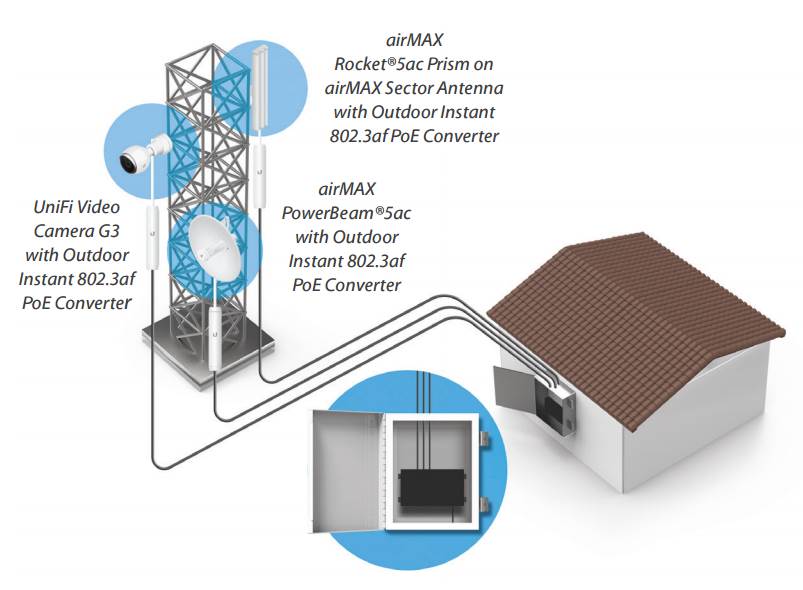 Ubiquiti Instant 802.3af Outdoor Gigabit PoE Converter - гигабитный преобразователь питания; обеспечивает возможность подключения устройств с поддержкой Passive PoE к коммутаторам 802.3af. Выполнен во всепогодном корпусе, может применяться для монтажа на улице.