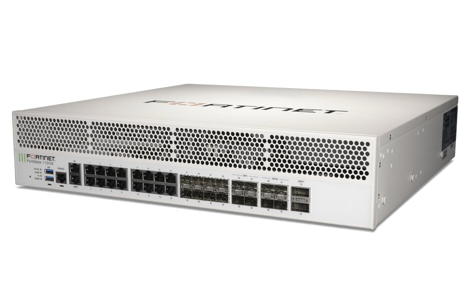 Fortinet FortiGate 1100E (FG-1100E) - межсетевой экран в рэковом исполнении (2U), оснащенный 16-ю портами RJ45 1 Gbps, 2-мя портами MGMT/HA RJ45 1 Gbps, 8-ю портами SFP 1 Gbps, 4-мя портами SFP+ 1/10 Gbps, 4-мя портами SFP28 10/25 Gbps, 2-мя портами QSFP 40 Gbps, 2-мя портами USB и консольным портом RJ45. Обеспечивает пропускную способность межсетевого трафика до 80 Гбит/с, до 8 000 000 сессий TCP, поддерживает до 100 000 правил брандмауэра.