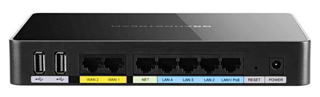Grandstream GWN7000 - маршрутизатор, оснащенный 7-ю портами RJ45 10/100/1000 Мбит/с (2 x WAN, 4 x LAN, 1 x LAN/VoIP) и 2-мя портами USB 3.0 (используются для подключения USB-носителей для организации коллективного доступа к файлам и для принтеров). Поддерживает подключение до 2 провайдеров, VPN (PPTP, L2TP/IPSec, OpenVPN, Site-to-Site VPN), DPI, QoS. Обладает встроенным контроллером для точек доступа Grandstream серии GWN.