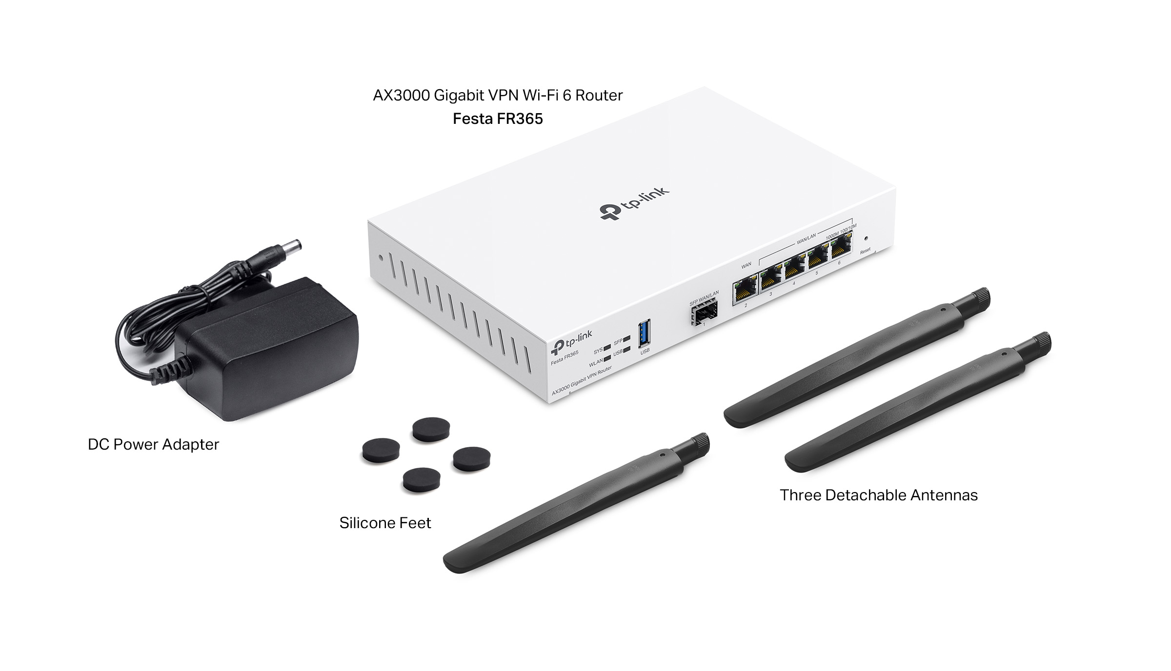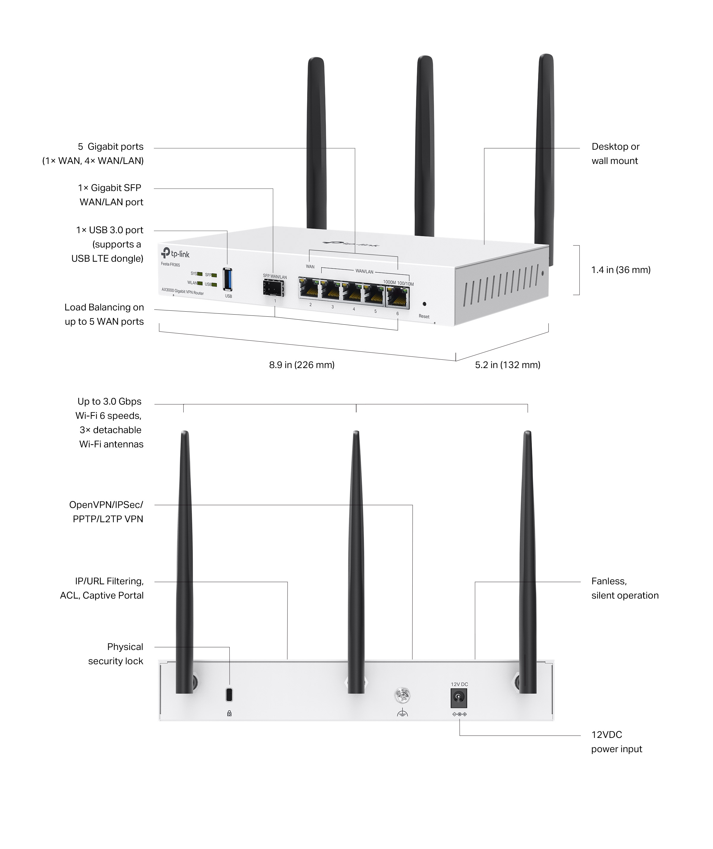 TP-Link Festa FR365 - гигабитный 6-портовый (1 x SFP WAN/LAN, 1 x RJ45 WAN, 4 x RJ45 LAN / WAN) маршрутизатор, оснащенный модулем Wi-Fi 6 и портом USB-A 3.0 для подключения 4G-модема / флеш-накопителя. Может работать в качестве VPN-сервера или VPN-клиента IPsec, PPTP, L2TP, OpenVPN, обеспечивает функционал брандмауэра. Модуль Wi-Fi обеспечивает скорость передачи данных в 574 Mbps в 2.4 GHz и 2402 Mbps в 5 GHz, может работать как standalone-устройство и как точка доступа, управляемая контроллером Festa. Устройство поддерживает подключение нескольких провайдеров в режиме Load Balancing / Failover.