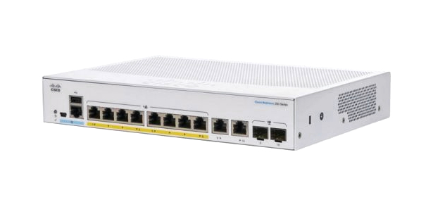 Cisco CBS250-8T-E-2G-EU - управляемый коммутатор с 8 портами RJ45 100/1000 Mbps и 2 портами Combo RJ45/SFP 1 Gbps. Оснащен системой пассивного охлаждения. Монтаж в 19" стойку.