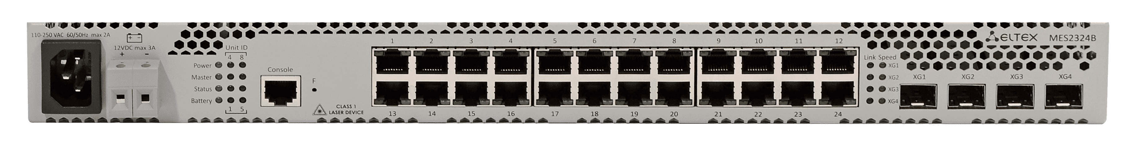 Eltex MES2324B - гигабитный стекируемый 28-портовый (24 x 10/100/1000 RJ45 + 4 x 10/100/1000 SFP) коммутатор с поддержкой Multicast и расширенными функциями безопасности. Модификация Eltex MES2324B позволяет подключить аккумуляторную батарею для обеспечения гарантированного питания в случае пропадания тока первичной сети 220 В. Оснащен системой пассивного охлаждения. Благодаря производительной аппаратной платформе, коммутатор обеспечивает пропускную способность до 128 Гбит/с. Конструктив коммутатора предусматривает монтаж в 19" стойку.