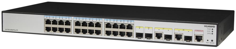 Huawei S1720-28GFR-4TP - управляемый коммутатор уровня доступа, оснащенный 24 портами 10/100/1000 Мбит/с RJ45, 2 комбо-портами 10/100/1000 Мбит/с RJ45/SFP и 2 портами 100/1000 Мбит/с SFP. Поддерживает SNMP, IGMP snooping, STP/RSTP/MSTP, обеспечивает пропускную способность до 128 Гбит/с.
