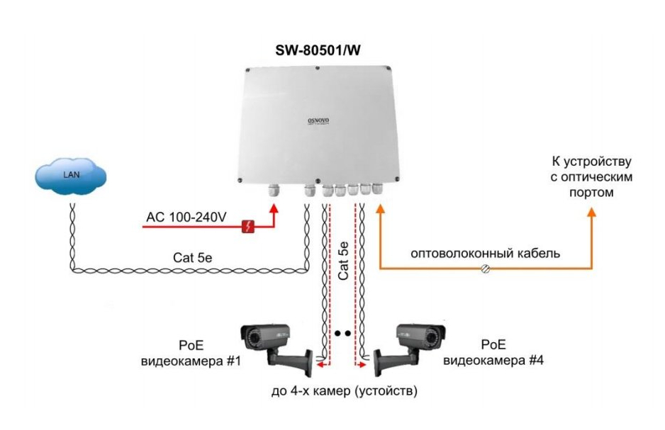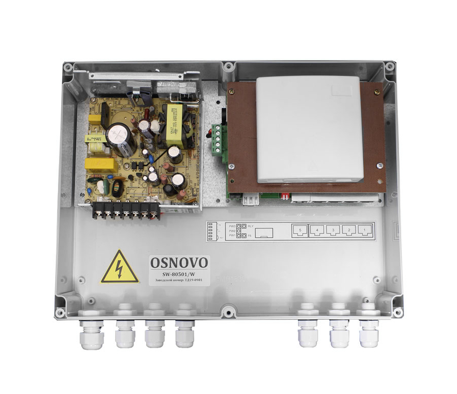 Osnovo SW-80501/W - уличный неуправляемый коммутатор, оснащенный 4-мя портами RJ45 1 Gbps с поддержкой PoE 802.3af/at (общий бюджет PoE - 120 Вт, до 30 Вт на порт), 1-м гигабитным портом RJ45, 1-м гигабитным портом SFP, встроенным оптическим кроссом и гермовводами для кабелей. Коммутатор соответствует стандарту IP66 (устойчив к пыли, влаге, температурам в диапазоне от -40 до 50° C). Выполнен в корпусе из поликарбоната.