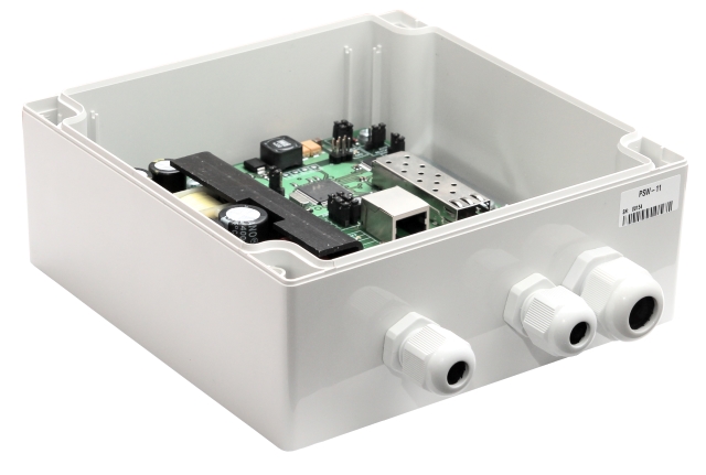 TFortis PSW-11 - неуправляемый уличный коммутатор, оснащенный 1-я портом 10/100 Мбит/с RJ45 с поддержкой PoE 802.3af / Passive (бюджет PoE - 15 Вт), 1-м портом 100/1000 Мбит/с SFP, встроенной грозозащитой и гермовводами для кабелей. Коммутатор соответствует стандарту IP66 (устойчив к пыли, влаге, температурам в диапазоне от -55 до 50° C).