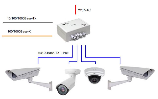 | Функции | Контроль зависания IP-камер питание IP-камеры и термокожуха по одному кабелю "витая пара" предварительный подогрев термокожухов |