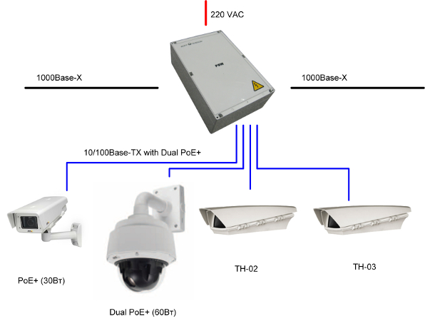 | Функции | Контроль зависания IP-камер питание IP-камеры и термокожуха по одному кабелю "витая пара" предварительный подогрев термокожухов |