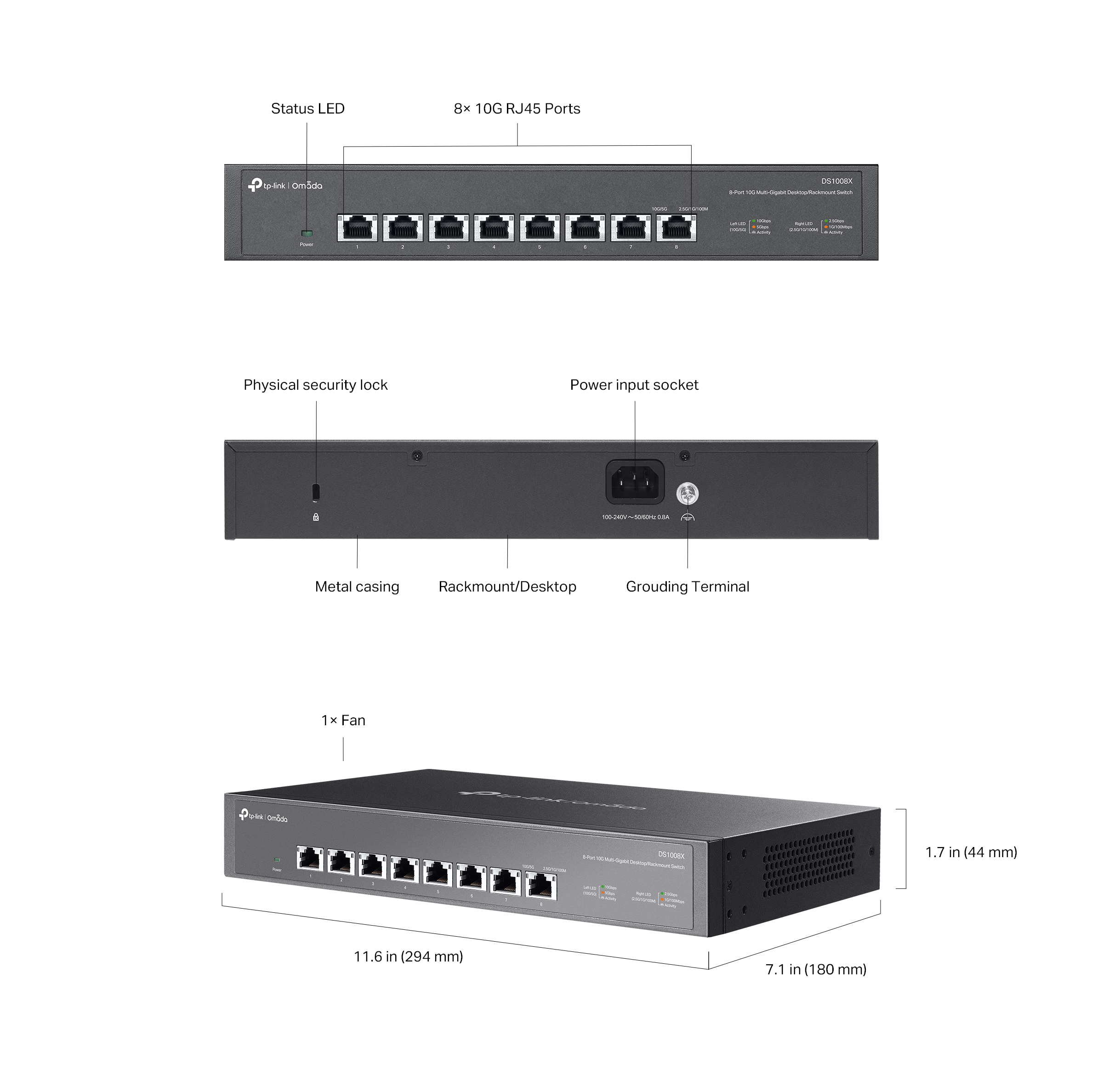 TP-Link Omada DS1008X - 10-гигабитный 8-портовый неуправляемый коммутатор серии Omada в универсальном настольном / 19" исполнении. Поддерживает QoS, 802.3X.