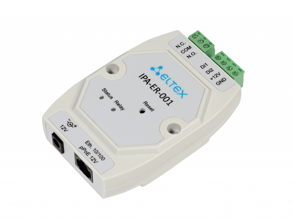 Eltex IPA-ER-001 - реле для управления электрической нагрузкой через интернет. Может использоваться для управления шлагбаумами, дверьми. Оснащено 1 портом RJ-45 10/100 Mbps, входом для дискретного датчика: геркона, концевика, оптопары. Предусмотрен монтаж на DIN-рейку.