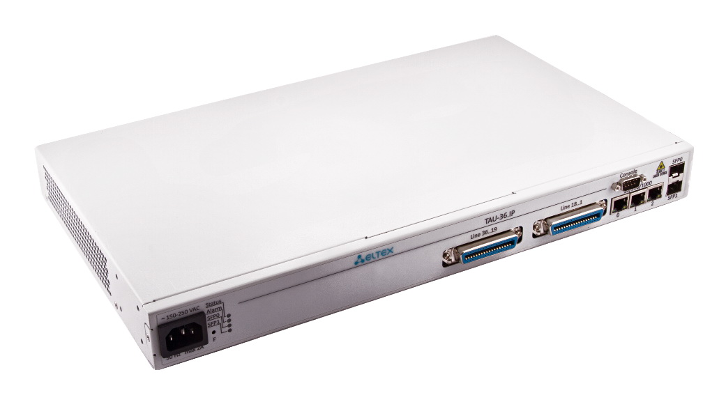 Eltex TAU-36.IP - 36-портовый FXS-шлюз с разъемом CENTRONICS-36. Может обеспечивать базовый функционал офисной АТС (коммутация внутренних номеров и ДВО). Оснащен 2-мя гигабитными портами LAN, гигабитным портом SFP. Шлюз обеспечивает функцию резервирования: при отсутствии связи с основным SIP-сервер, производится автоматическое переключение на резервный SIP-сервер с контролем работоспособности основного. При потере связи с обоими серверами IP-телефонии, сохраняется возможность локальной связи между абонентами шлюза. Поддерживает монтаж в стойку.