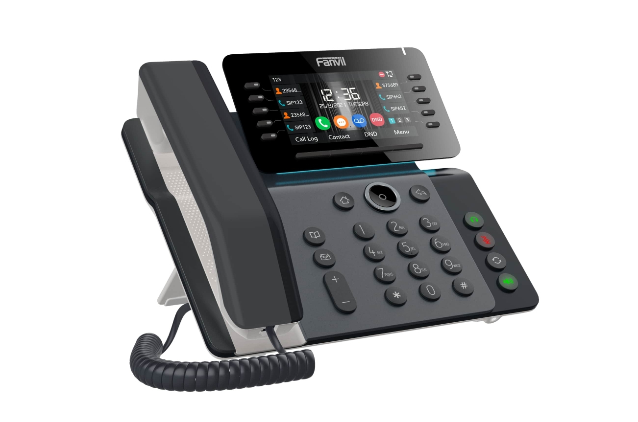 Fanvil V65 - IP-телефон с поддержкой 20-ти SIP-аккаунтов и 6-сторонней конференции. Оснащен встроенными модулями Wi-Fi (2.4 и 5 ГГц) и Bluetooth, регулируемым, цветным 4.3" экраном, 2-мя портами RJ45 10/100/1000 Mbps с поддержкой PoE, 1-м портом USB. Аппарат обеспечивает звук HD-качества.
