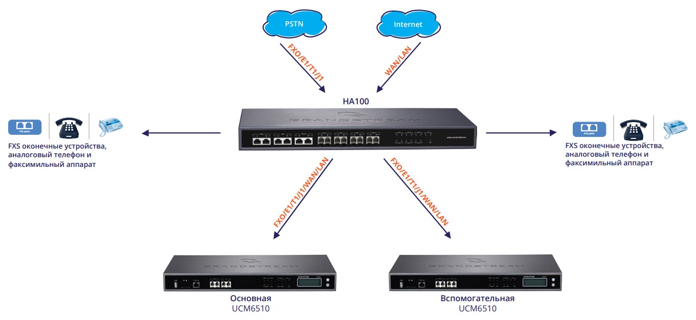 Grandstream HA100 - контроллер, служащий для построения отказоустойчивой системы телефонии на базе 2-х IP-АТС Grandstream UCM6510. Контроллер непрерывно отслеживает состояние IP-АТС и позволяет выполнить полное переключение системы за 10-50 секунд (в зависимости от количества зарегистрированных SIP-устройств) с вышедшей из строя IP-АТС на резервную.