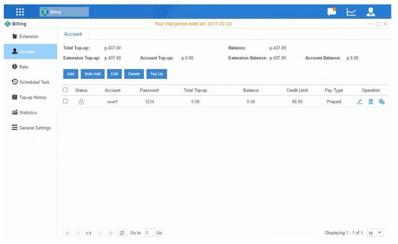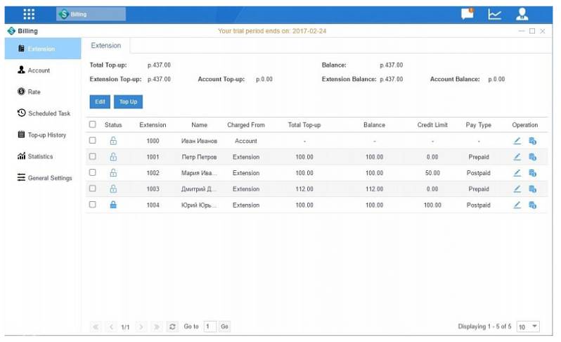 - Управление кредитованием вызовов. Предусмотрены различные кредитные лимиты как для внутренних номеров, так и для аккаунтов. Также при совершении звонков абоненту будет предложено ввести пароль, соответствующий определенному внутреннему номеру (либо аккаунту). Кредитование происходит за счет учетной записи, чей пароль был использован. При этом одним аккаунтом пользуются несколько абонентов, знающих пароль.