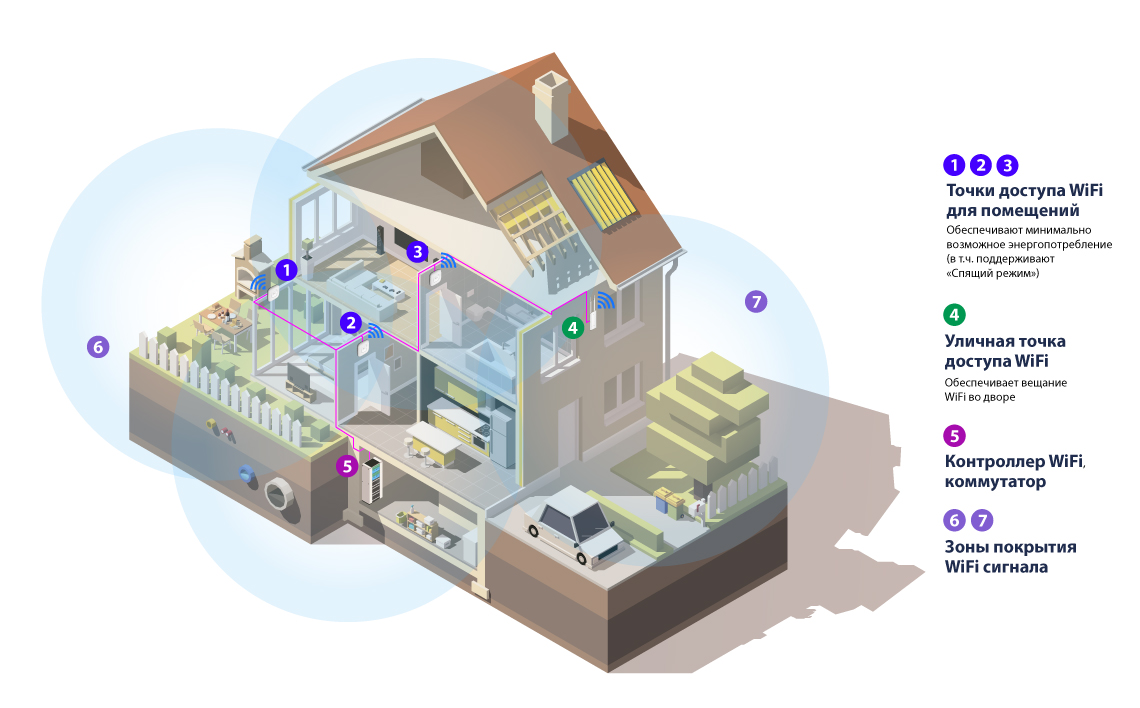 WiFi в частном доме (коттедже, таунхаусе) давно перестал быть элементом роскоши. Теперь это один из ключевых элементов инфраструктуры наравне с электричеством, отоплением и водопроводом. WiFi в частных домовладениях используют для подключения к сети персональных компьютеров, планшетов, смартфонов, телевизоров, камер видеонаблюдения, игровых консолей и прочих гаджетов и элементов "умного дома". Важной характеристикой сети WiFi для дома является ее т.н. "бесшовность", т.е. такая структура сети, когда при переходе из зоны действия одной точки доступа в зону действия другой мобильное устройство не теряло соединение с сетью.